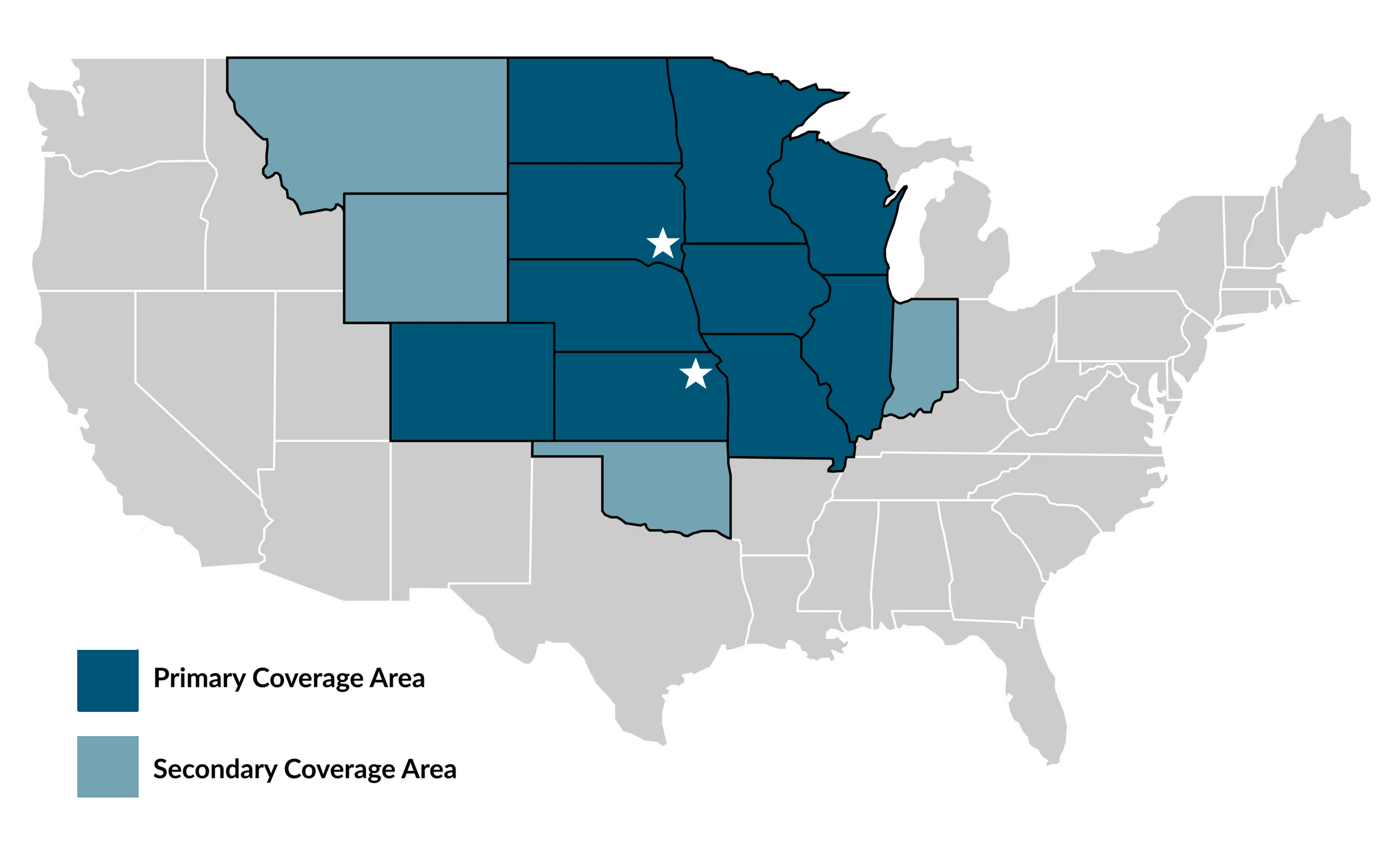 With over 150 clients across the Midwestern United States, we proudly serve North Dakota, South Dakota, Nebraska, Kansas, Missouri, Iowa, Minnesota, Wisconsin, and Illinois, with additional service coverage in Montana, Wyoming, Oklahoma, and Indiana.